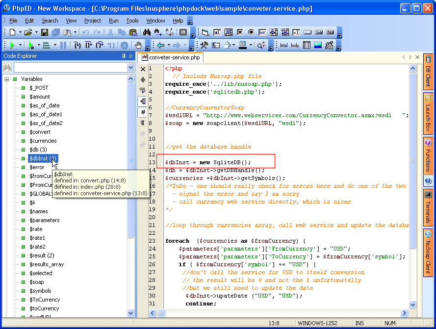 • If the selected element is a PHP variable, the cursor display will provide insight into where the variable is used and/or defined. If the design of a PHP application involves the same variable used in more than one PHP File or in multiple locations in the same PHP File, the PHP Designer can navigate between different instances of the same PHP variables by repeatedly clicking on that variable. For example, the illustration below shows the occurrences of PHP Variable $dbInst. This particular design has three files, of which one is shown in the following illustration: